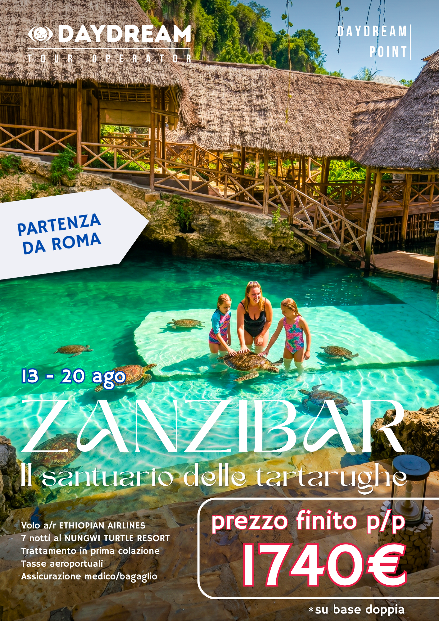 Scopri Zanzibar con Daydream: 7 notti al Nungwi Turtle Cave Resort tra spiagge bianche e tartarughe marine. Volo da Roma e relax incluso. Scarica Qui